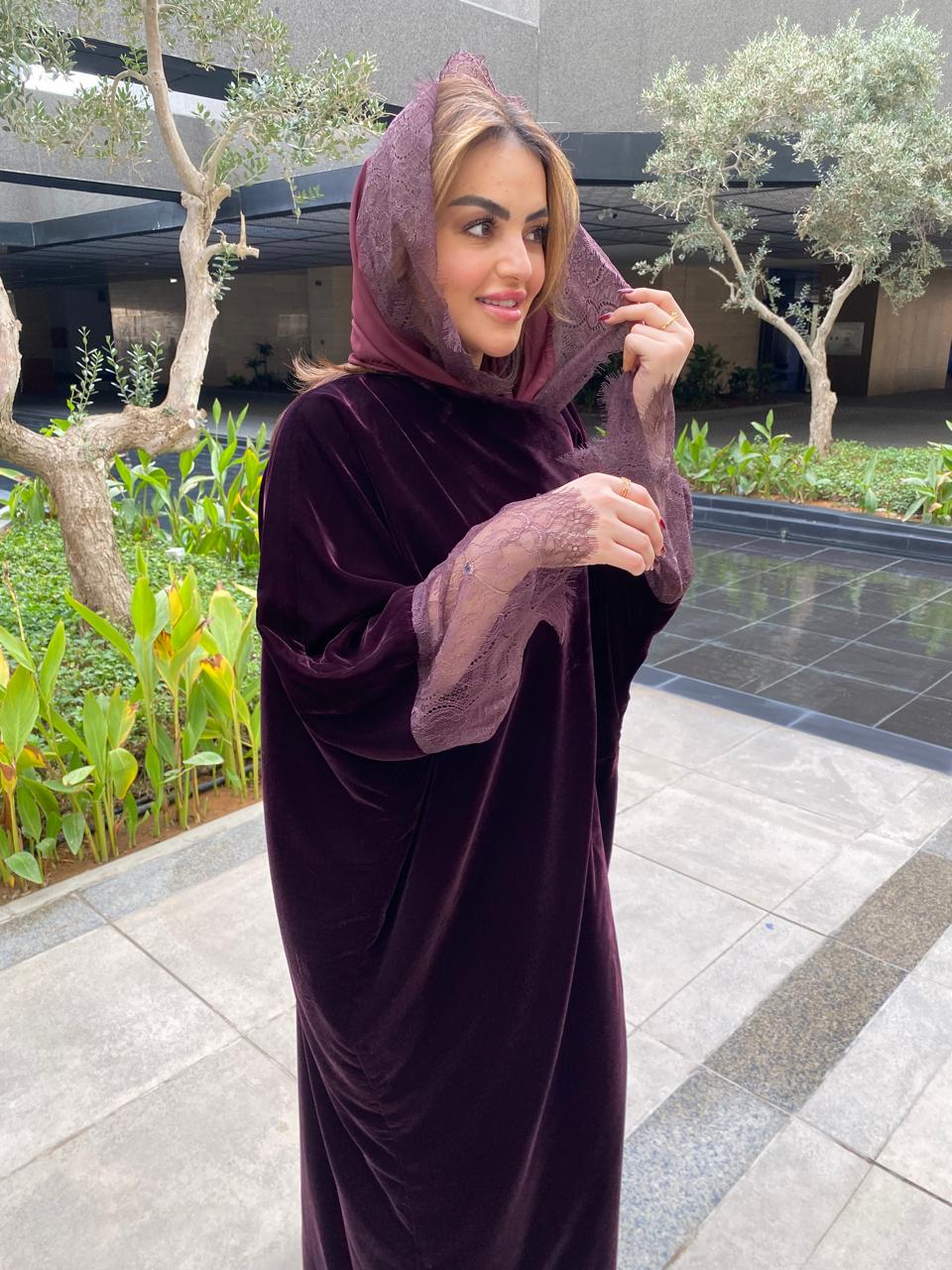 A luxurious velvet abaya accented with elegant lace details,