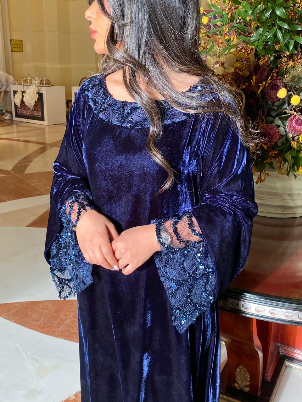 A French velvet jalabiya featuring sequined tulle details on