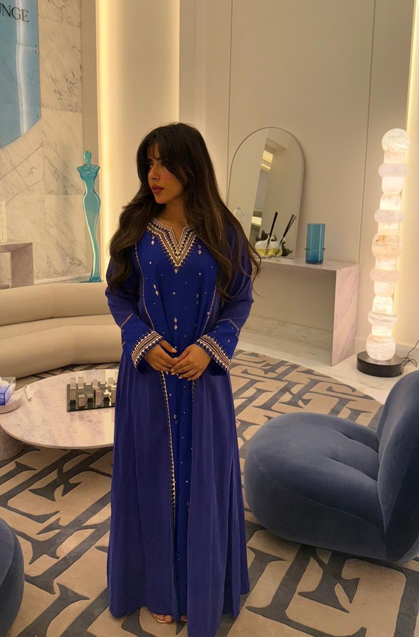 A Pure Silk Naqda jalabiya with optional French velvet, washed silk, or ceramic fabric in a royal blue tone, featuring delicate embroidery for a refined and elegant look perfect for special occasions.